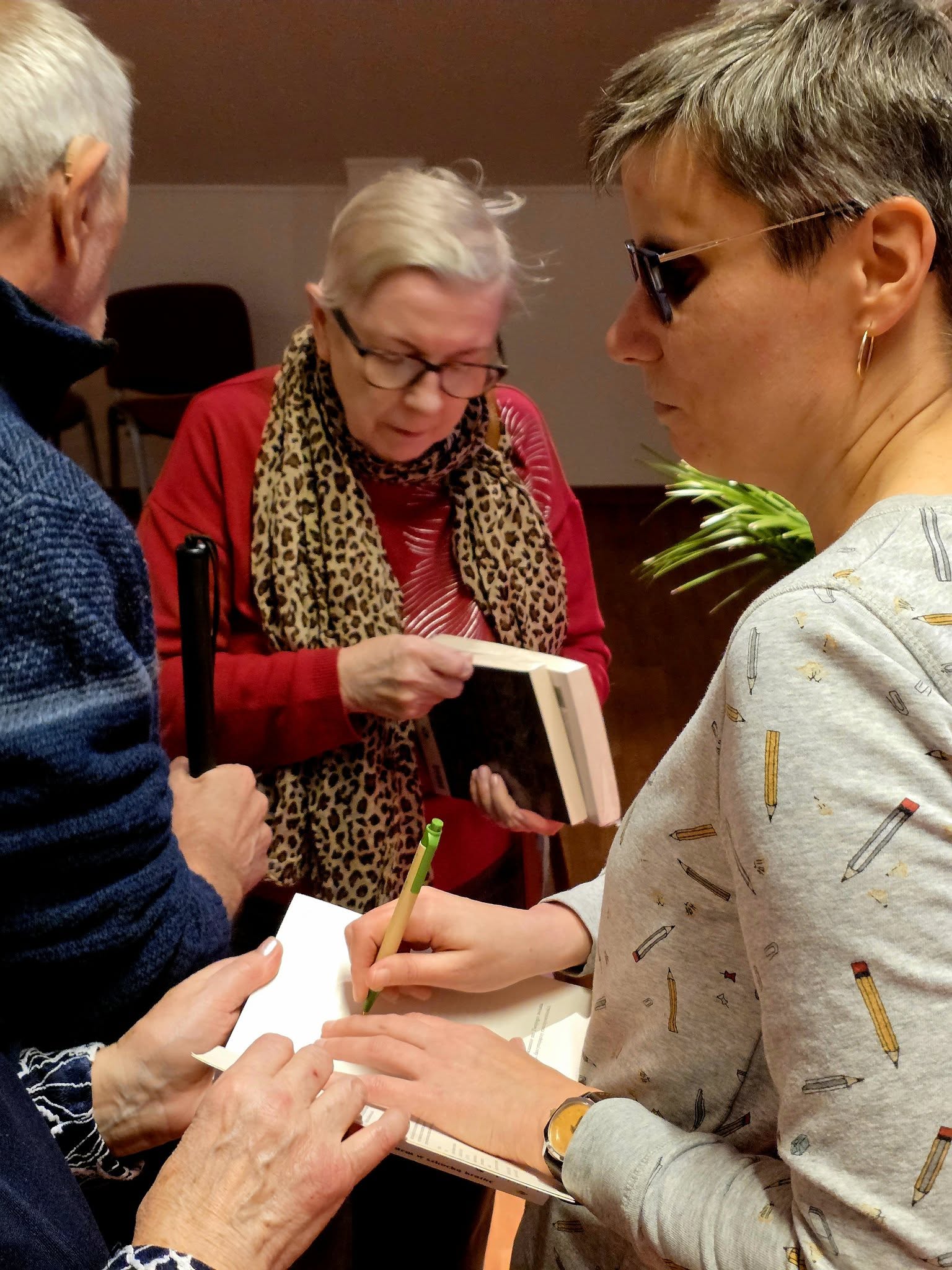 Pojawiły się także wątki osobiste, wspomnienia z dzieciństwa, historie związane z hobby, między innymi jazdą tandemem i odkrywaniem nowych miejsc. Każda opowieść niosła anegdotę, lekką w formie, a jednocześnie odsłaniającą ważny fragment doświadczeń pisarki. Humor przeplatał się z refleksją, dzięki czemu publiczność słuchała z uśmiechem, ale i z uważnością.