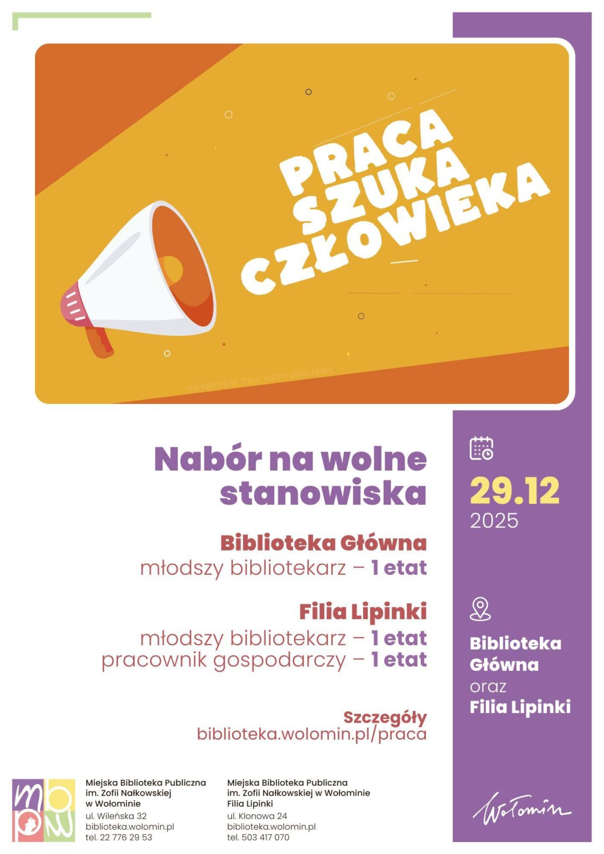 📄 Dokumenty aplikacyjne (CV, list motywacyjny i wymagane oświadczenia) przyjmujemy do 29 grudnia 2025 r. do godz. 17:00 pocztą tradycyjną lub w siedzibie biblioteki przy ul. Wileńskiej 32 w Wołominie (prosimy o dopisek z nazwą stanowiska).